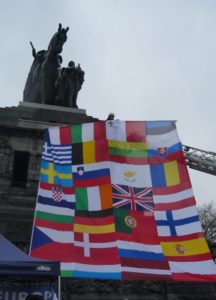 Pluralität ist unsere Stärke. Die Möglichkeit für jede/n, auf den Foren der Zivilgesellschaft das Wort zu ergreifen, sich Gehör zu verschaffen und ernst genommen zu werden, ist urdemokratisch. Diese demokratische Teilhabe stärkt die notwendige Bindung untereinander. So wie es der Kommissionspräsident Jean-Claude Juncker in seinem Grußwort zu einer Veranstaltung von Pulse of Europe Koblenz im Dezember 2017 zum Tag der Einigung auf den Lissabon-Vertrag formulierte: „Seit es dies zivilgesellschaftliche Engagement gibt, fühlt man sich weniger allein in dieser hochkomplizierten Europäischen Union“. Aus diesem Anlass hat PoE Koblenz das Deutsche Eck, symbolisch für einen Tag in „Europäisches Eck“ umbenannt und die große „all in one – Fahne“ gehisst. Sie vereint alle Fahnen der Mitgliedsstaaten zu der Zeit. (vgl. die Bilder hier) Solch phantasievolle Aktionen können die emotionale Bindung an Europa vertiefen. Denn Europa ist nicht nur eine intellektuelle Herausforderung sondern auch eine Herzensangelegenheit. Das manifestiert sich auch beim gemeinsamen Singen der Europahymne.
