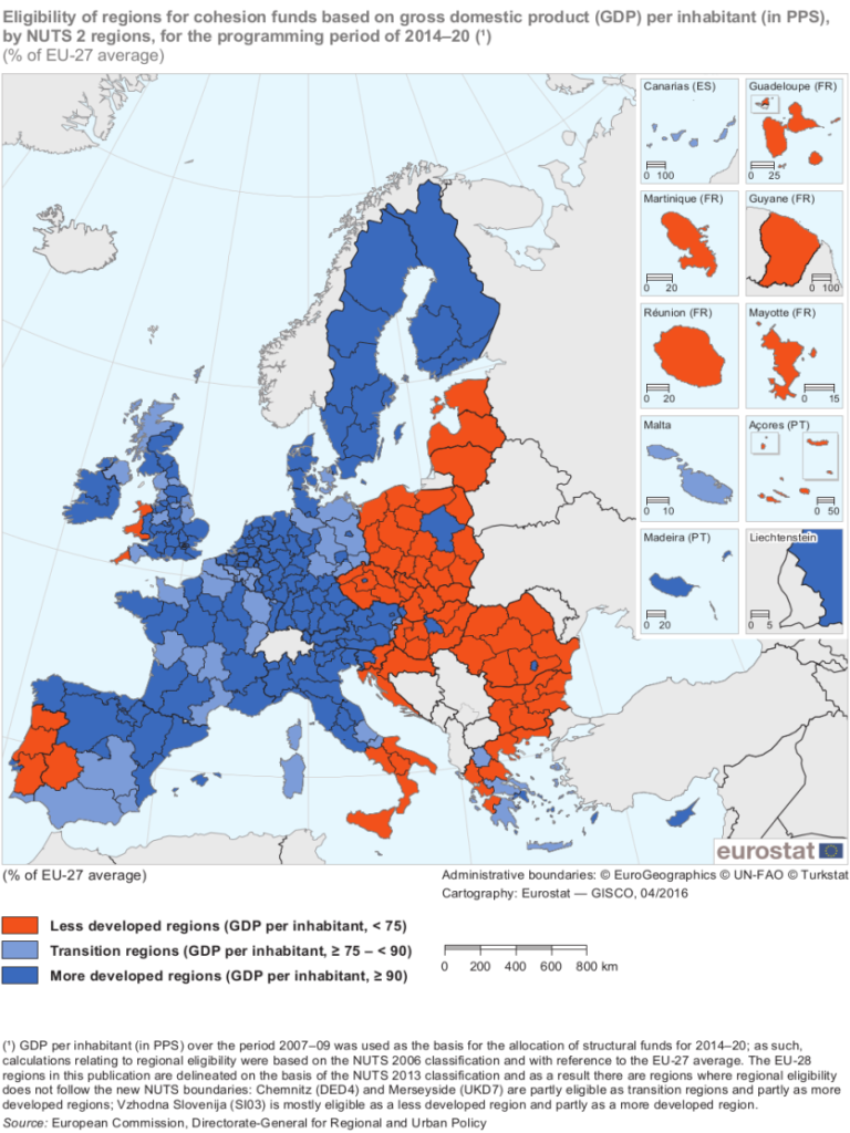 Hinzu kommt, es gibt kaum Indikatoren (Messgrößen), um die Wirkung von Fördermaßnahmen der Regionalpolitik objektiv zu beurteilen. Man könnte daran denken, das Bruttoinlandsprodukt BIP pro Kopf in der betreffenden Region zu Beginn der Förderung und an ihrem Ende bzw. 5 oder 10 Jahre später zu messen und dann zu vergleichen, wie das in der Studie über Ostdeutschland getan wurde. Ausgedrückt in Kaufkraft Standards reichte im Jahre 2018 das regionale pro Kopf BIP von 30% des EU Durchschnitts in der französischen Überseeregion Mayotte bis zu 263% in Luxemburg. Der „Speckgürtel“ der EU zieht sich in den Regionen von Oberitalien über Österreich nach Bayern, Baden-Württemberg, Nordrhein-Westfalen bis in die Niederlande und Belgien. (Karte des BIP pro Kopf in den Regionen der EU 2018 Pressemitteilung von eurostat vom 5.3.2020. bzw. 2017)