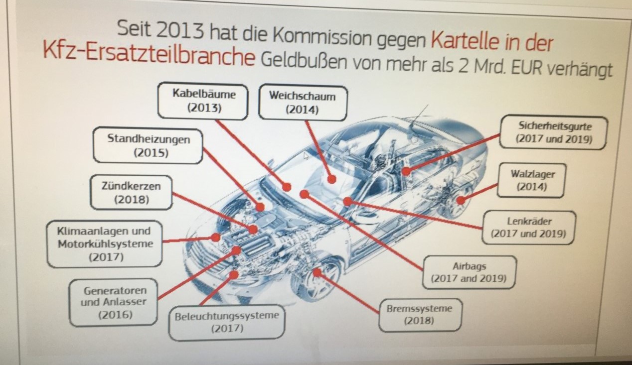 – Seit 2013 hat die Kommission Strafen gegen Kartelle in der Kfz-Ersatzteilbranche von mehr als 2 Milliarden Euro verhängt. Es handelt sich um 12 illegale Absprachen zu Standheizungen, Walzlagern, Sicherheitsgurten, Lenkrädern, Airbags, Bremssystemen, Klimaanlagen, Beleuchtungssystemen, Zündkerzen und Kabelbäumen (EU Kommission. Bericht über die Wettbewerbspolitik 2018, COM 2019/339 final, S. 7):