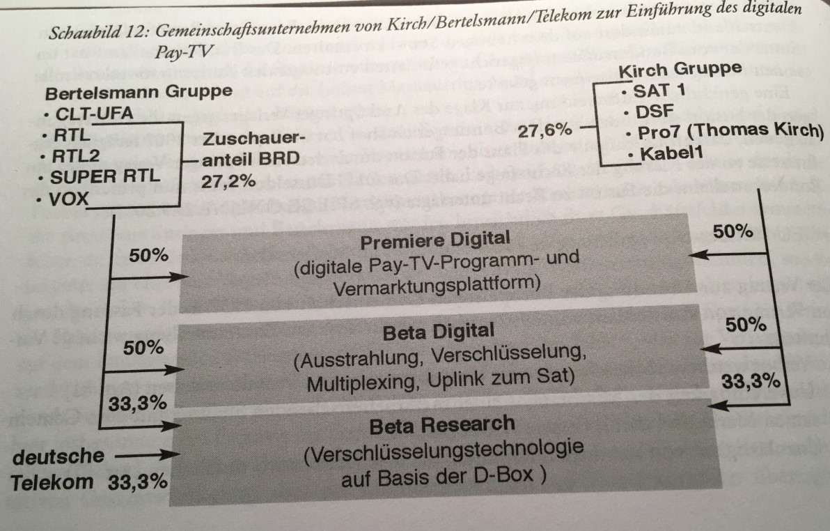 – 1997 meldeten die CLT-UFA, die zur Bertelsmann Gruppe gehört, und die Taurus Beteiligungs-GmbH, die zur Kirch Gruppe gehört, bei der EU Kommission an, dass sie beabsichtigten, die gemeinsame Kontrolle bei den Unternehmen „Premiere“ – Pay TV-Veranstalter auf einer digitalen Plattform -, „Beta digital“ – Sendezentrum – und „Beta Research“ Verschlüsselungstechnik, Bereitstellung der d-box – je zur Hälfte zu übernehmen. An Beta Research sollte neben CLT-UFA und Taurus auch die deutsche Telekom mit je 33% beteiligt werden.